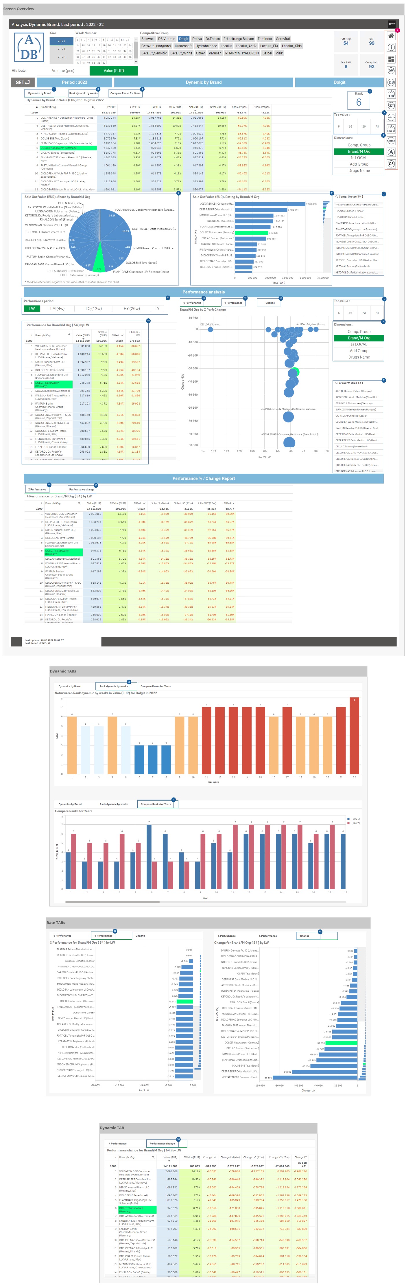 Analysis Dynamic Brand Screen intended to get detailed Info about sales dynamics, market share and Part of the total value by the selected analytical dimension in selected & previous periods in Value (EUR) or Volume (pcs) in a tabular report, charts and graphics. This screen also shows the Performance Changes, % Performance and Changes for any of selected analytical dimensions and Ratings of our Brand/M Org, Add Group, Drug Name by Sale Out.