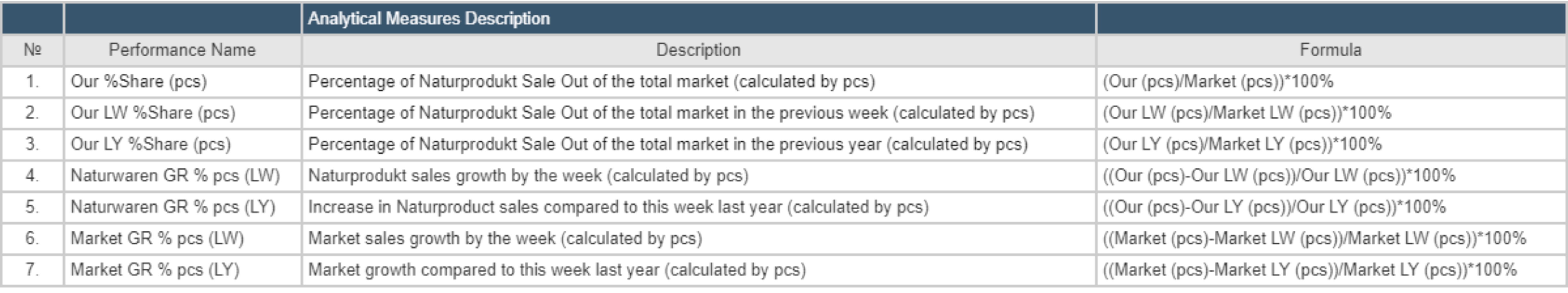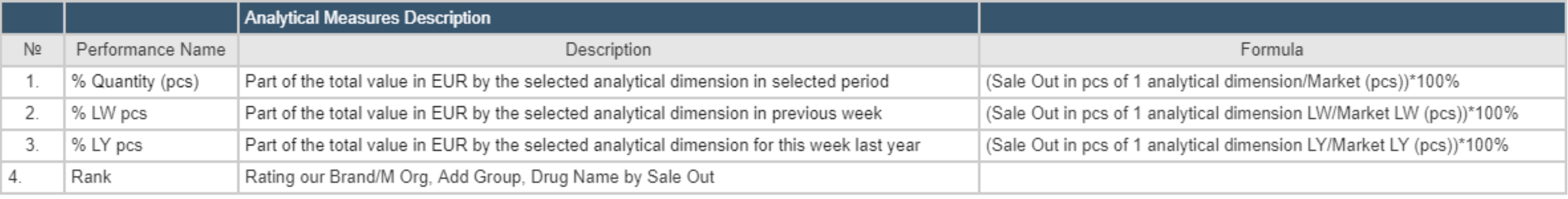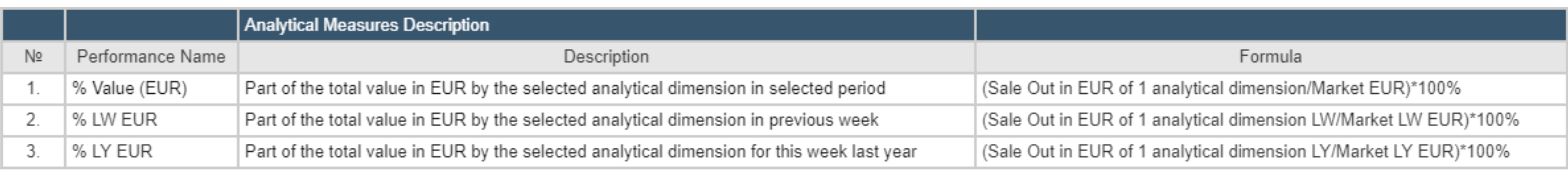 The analytical model shows the hierarchy of Measures. Measurements are divided into 4 main groups: Performance KPI, Calculated Measures, Share Measures (Vertical) and Base Measures. Below is detailed information on each of the Measures.