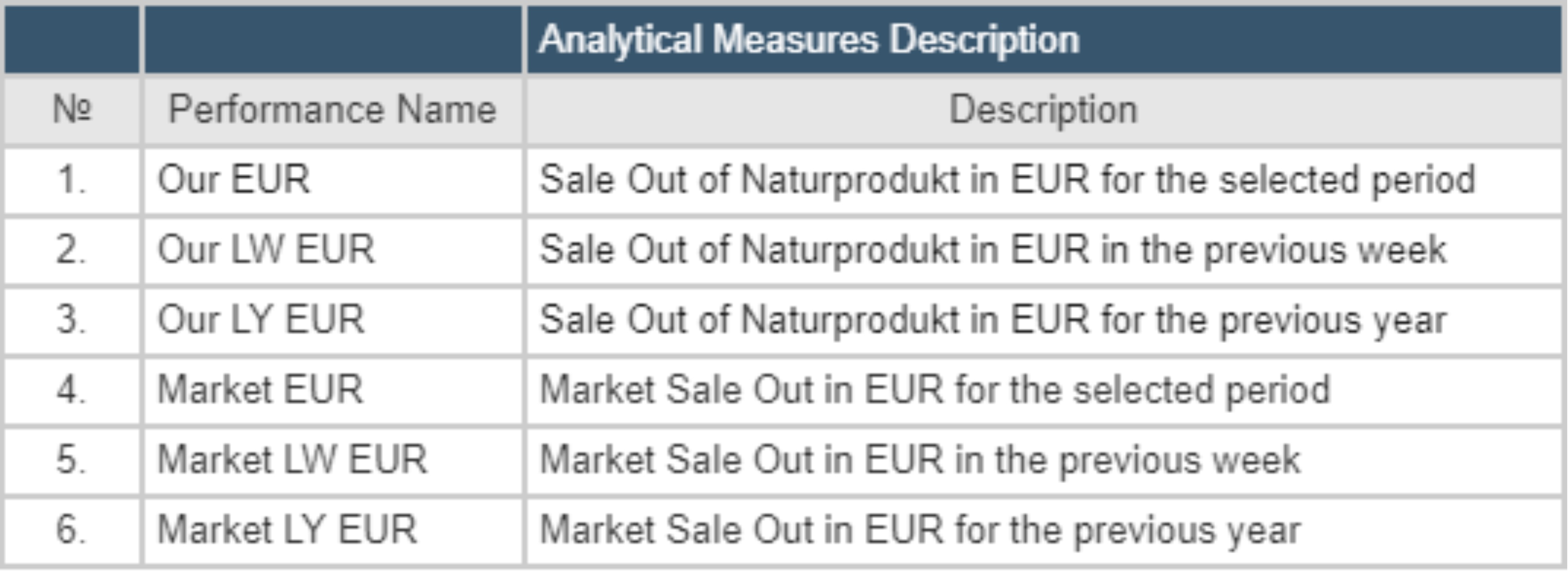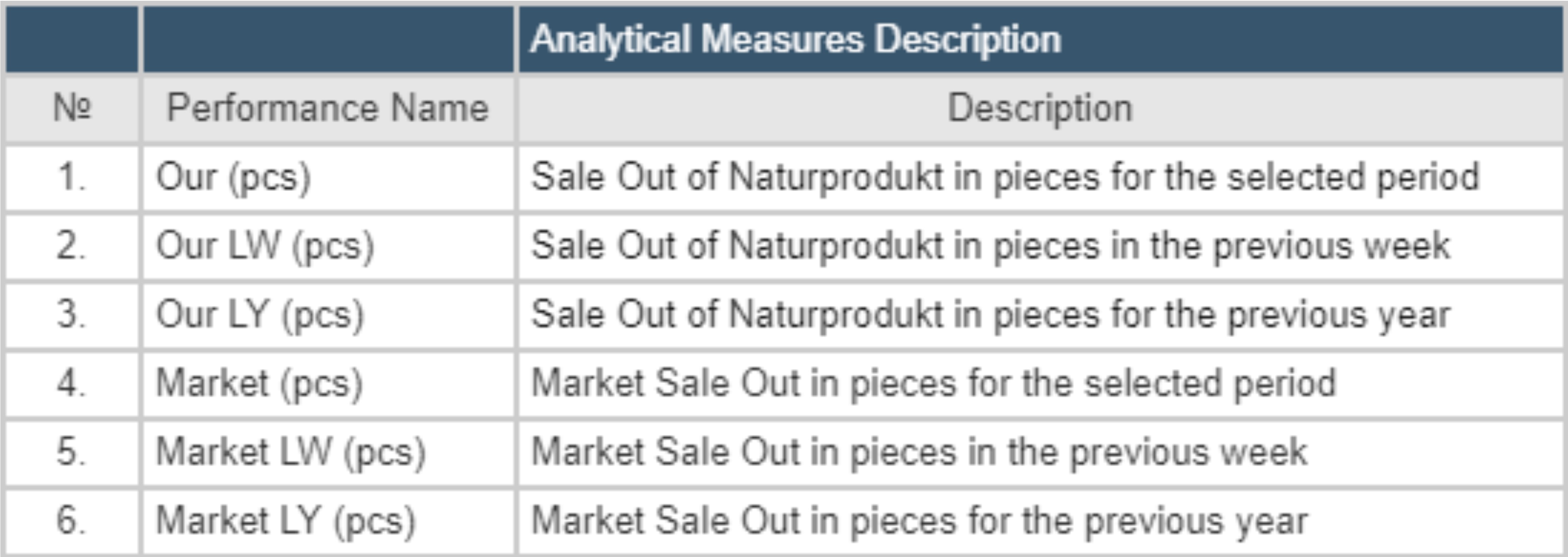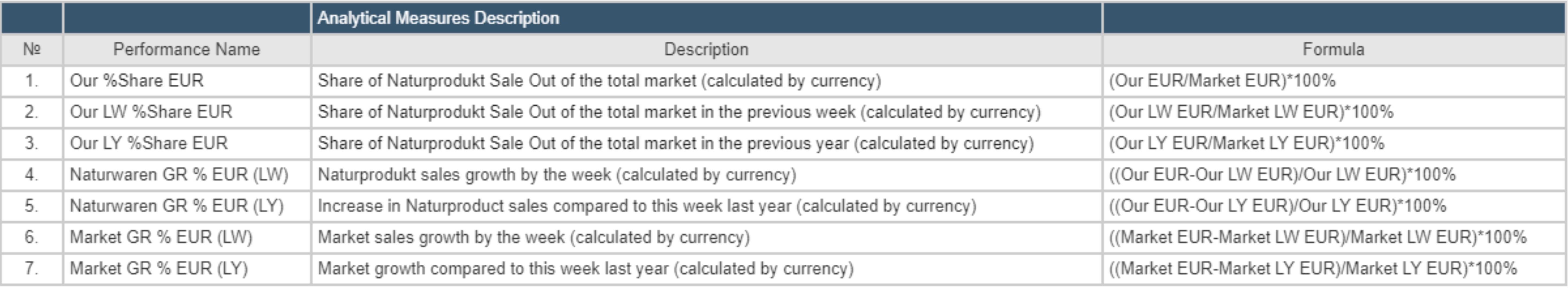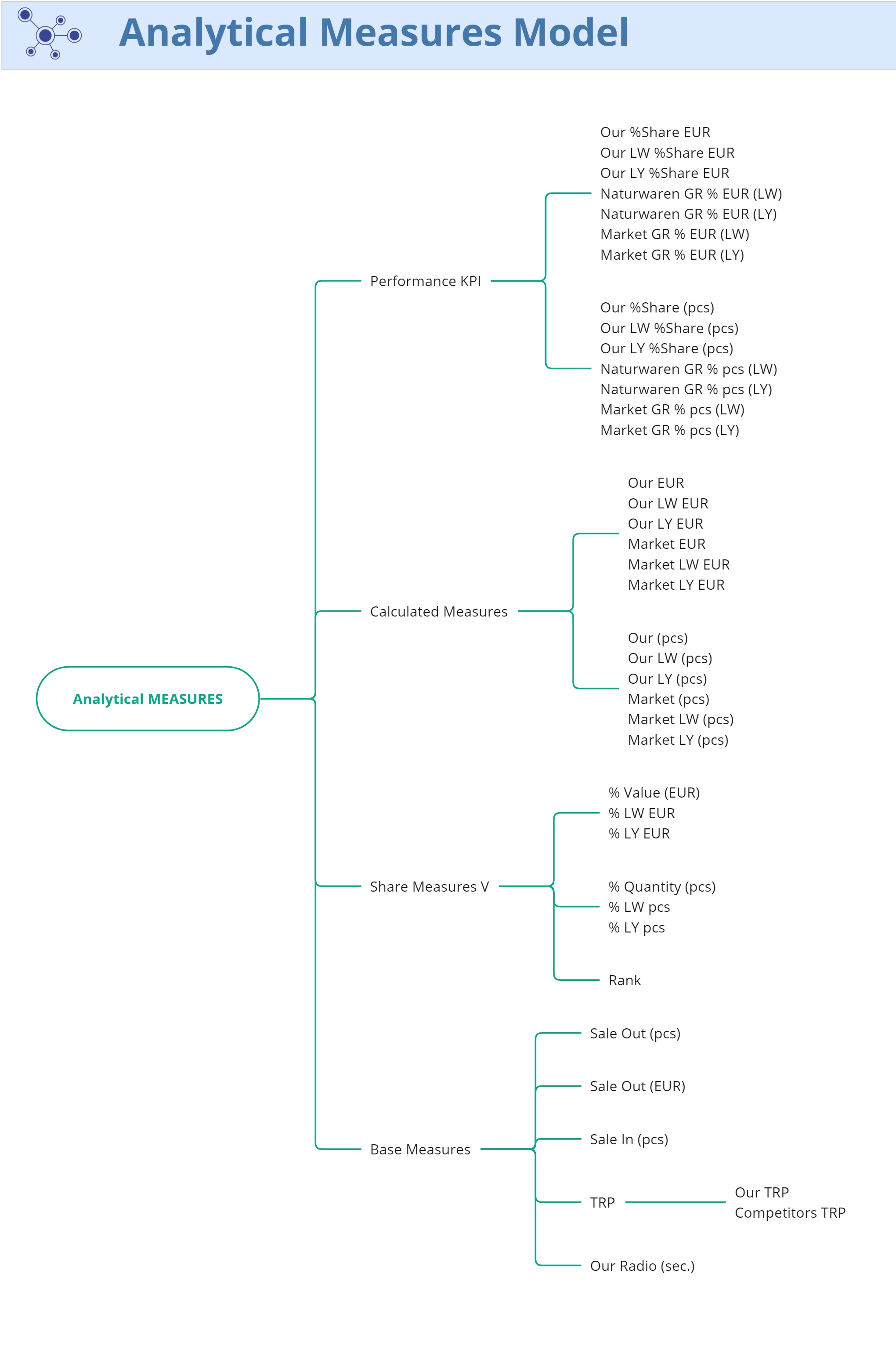 The analytical model shows the hierarchy of Measures. Measurements are divided into 4 main groups: Performance KPI, Calculated Measures, Share Measures (Vertical) and Base Measures. Below is detailed information on each of the Measures.